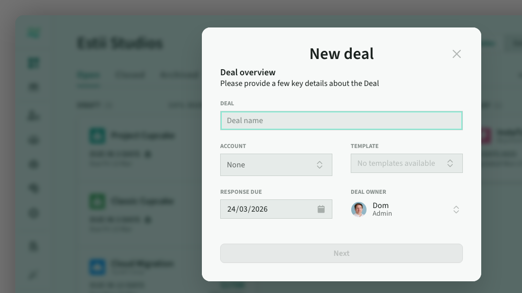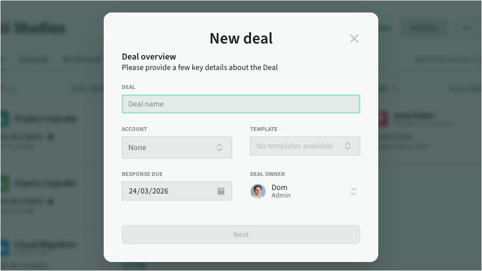 To launch the New deal setup dialogue, navigate to the pipeline and click New deal.
