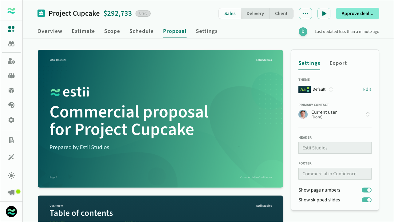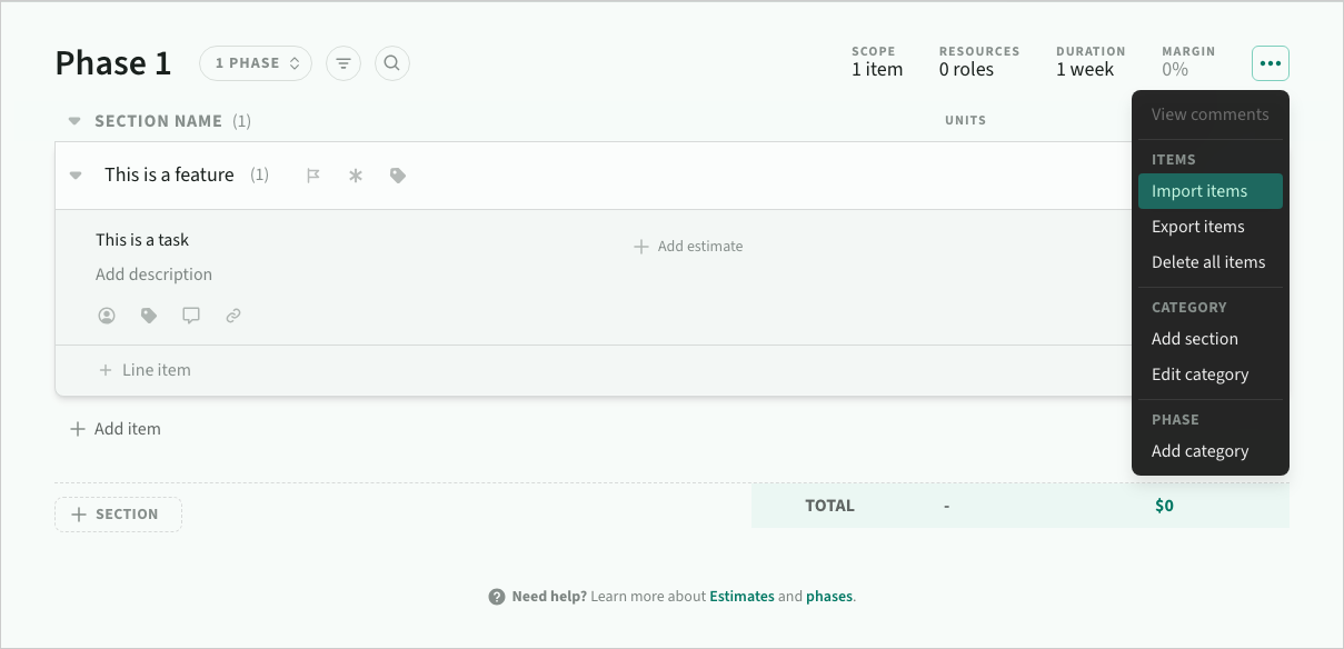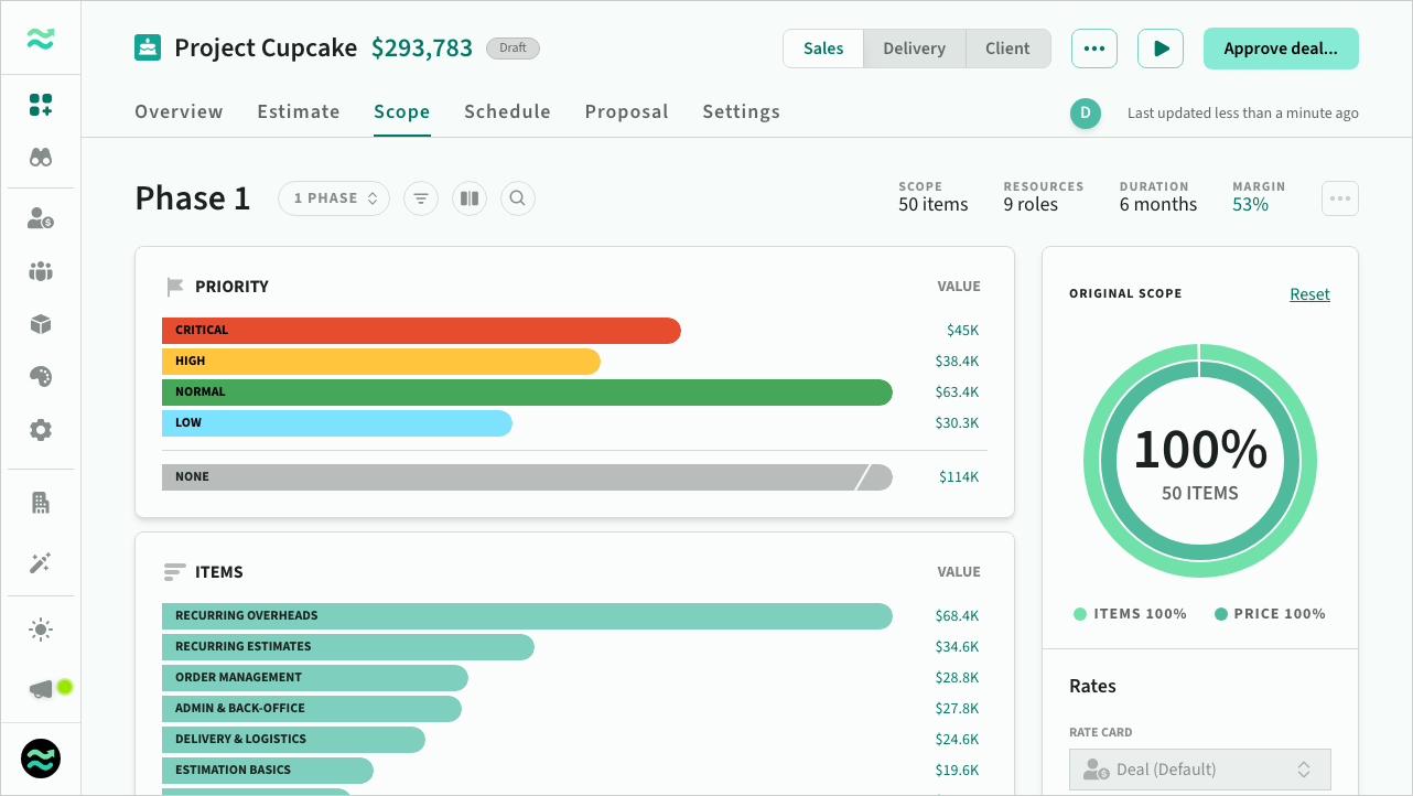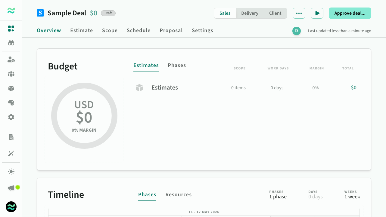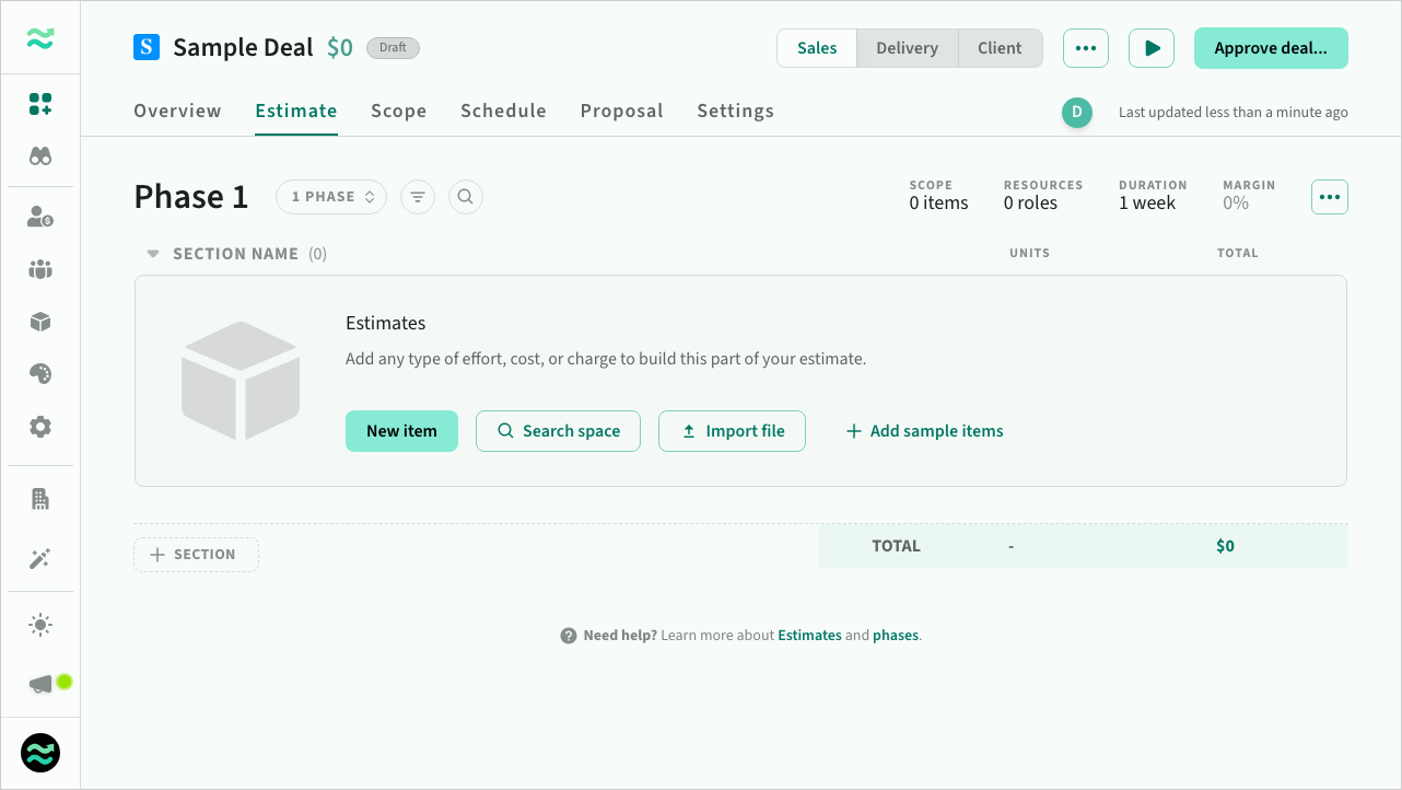 - Estimation - populating the deal with raw estimates and requirements (as items and line items within phases)