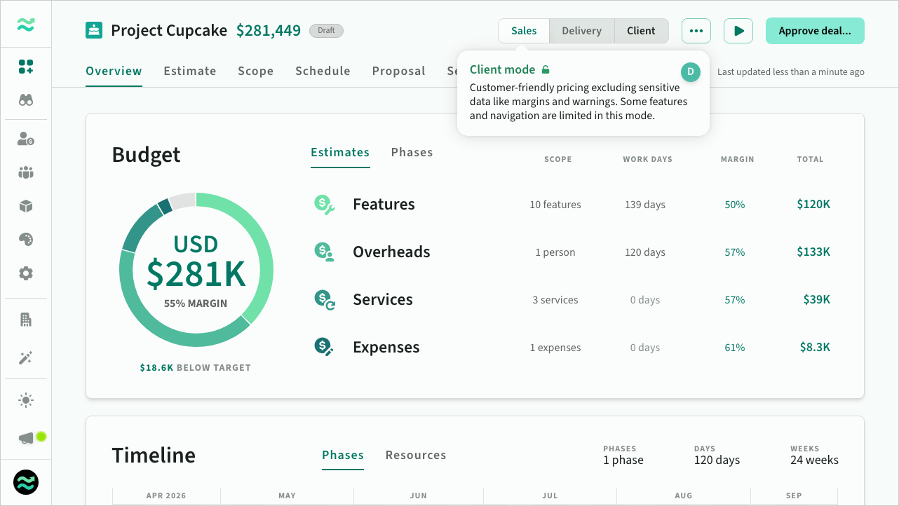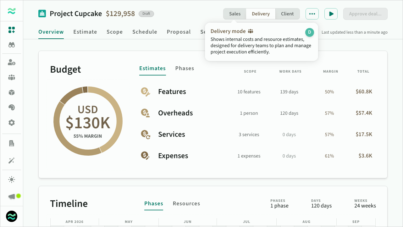 This mode is for delivery teams, focusing on internal costs and resource planning to ensure efficient project execution.