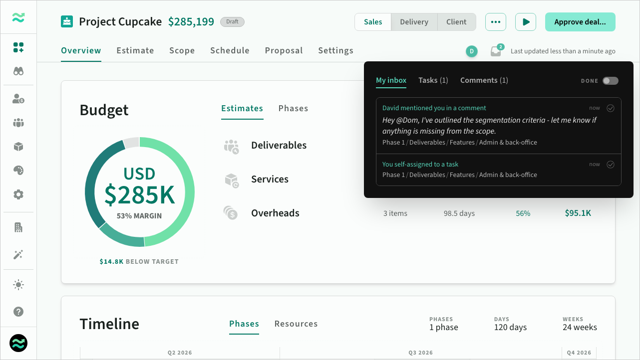 Tailored for sales teams, this mode shows pricing, margins, and the total value of projects to help optimise proposals and negotiations.
