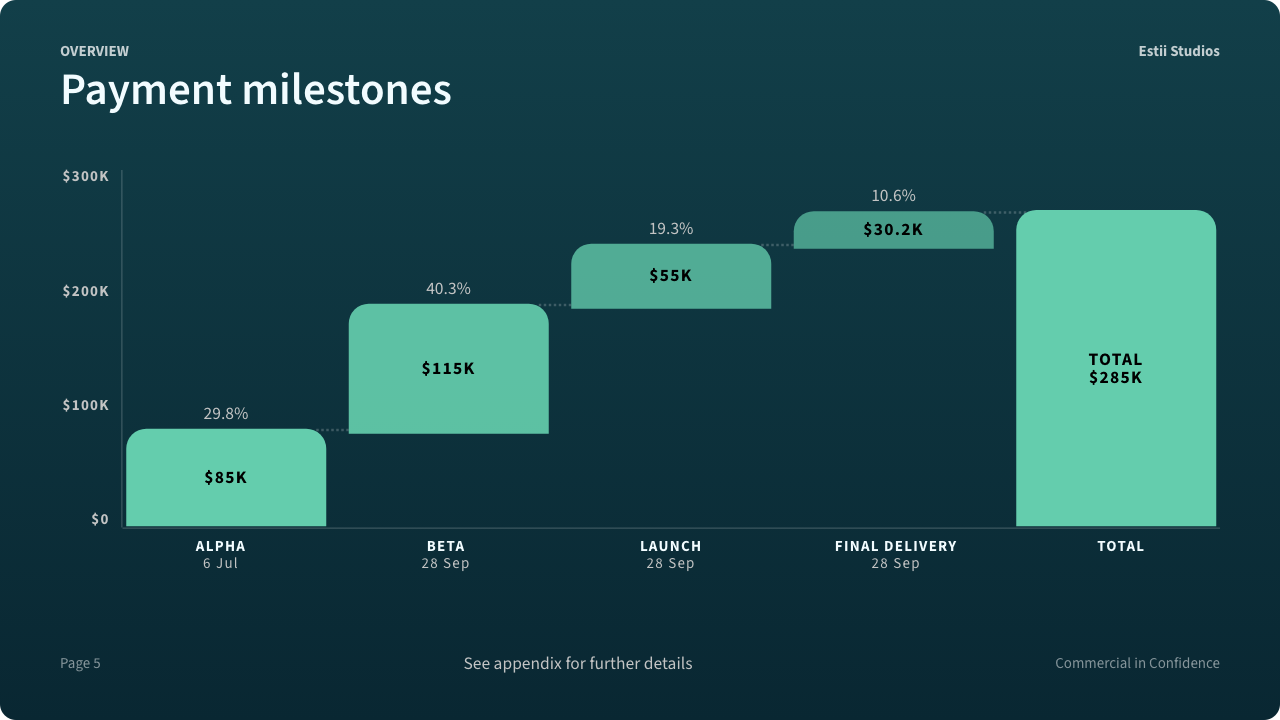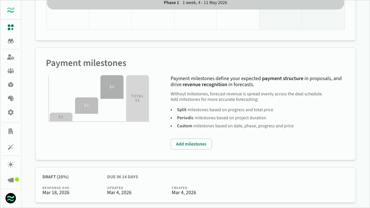 - Milestones are exported to proposals as clear, easy-to-understand waterfall charts.