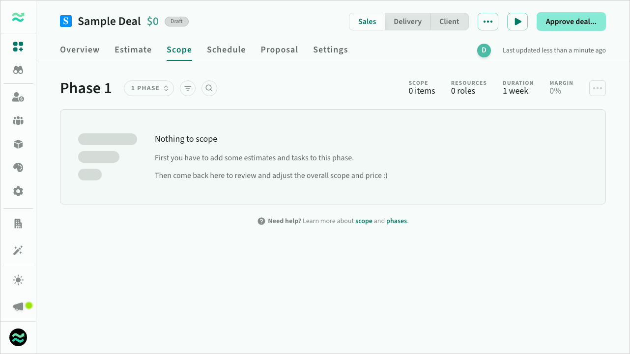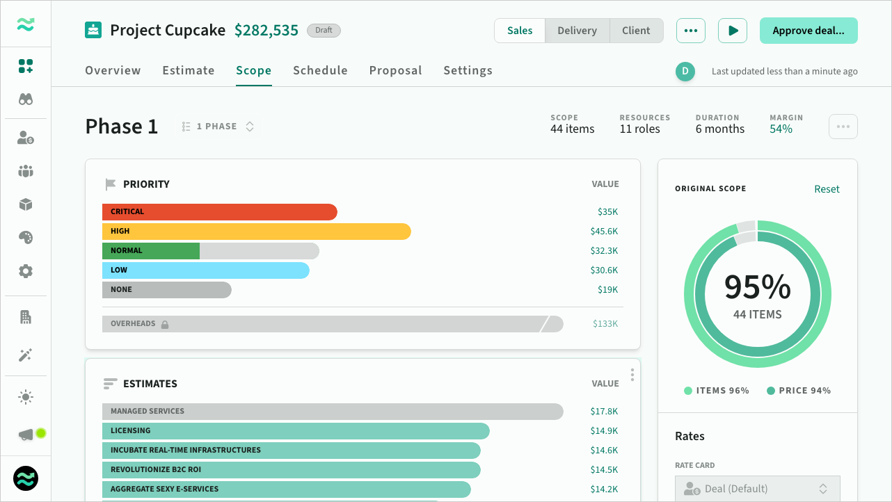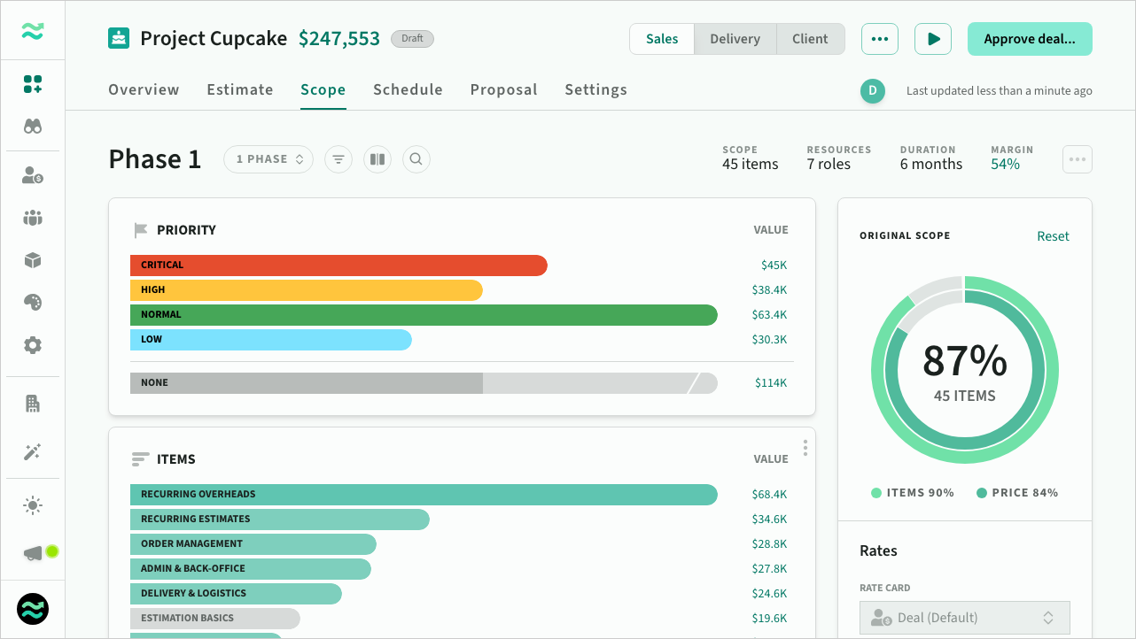 You can adjust the active rate card for the Phase from either the Scope or Schedule settings panel (they share the same rate card property). When you change the rate card or margin, the price and value of all roles will update automatically. Note that multiple rate cards is only available on Business and Enterprise plans.