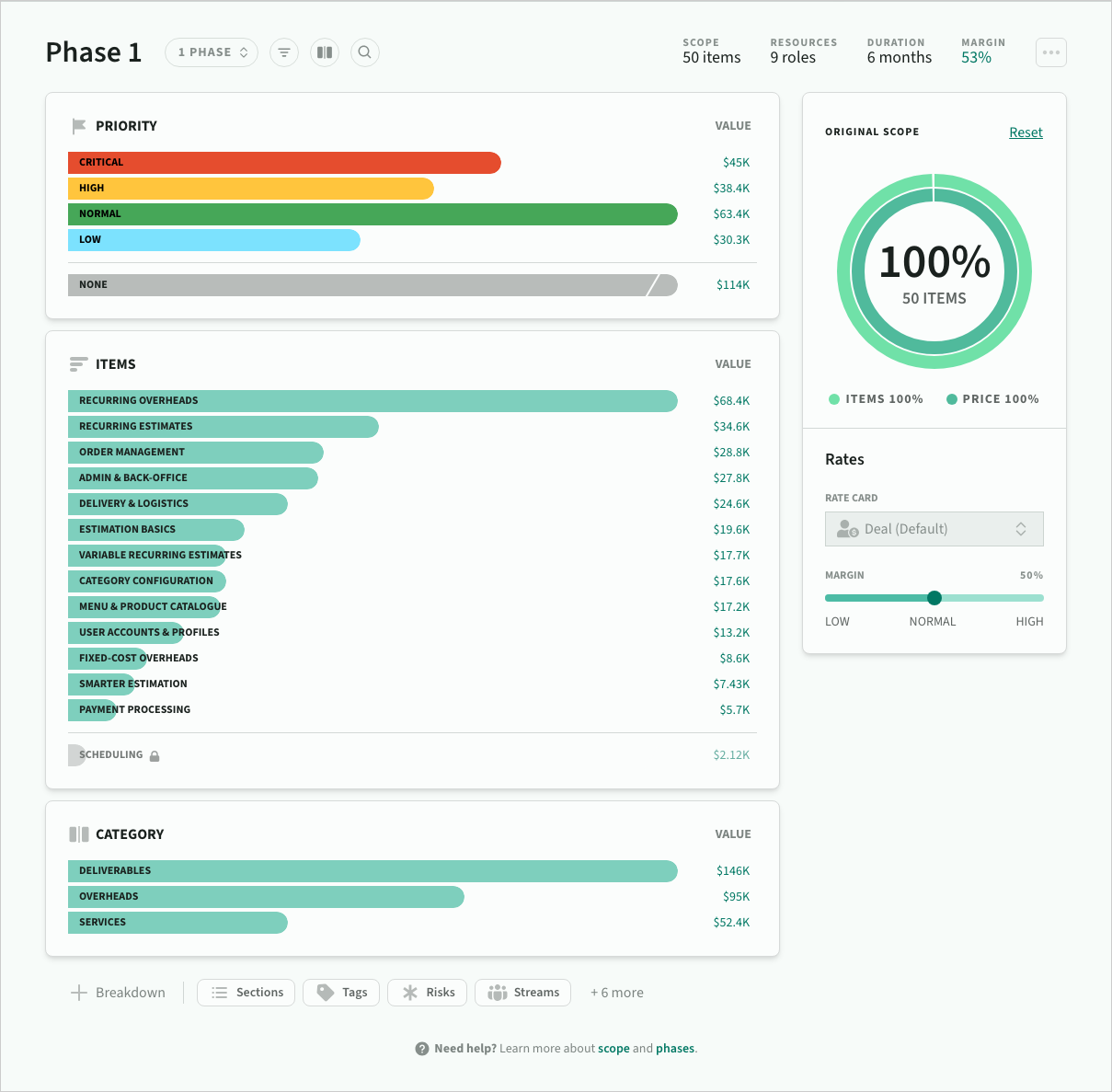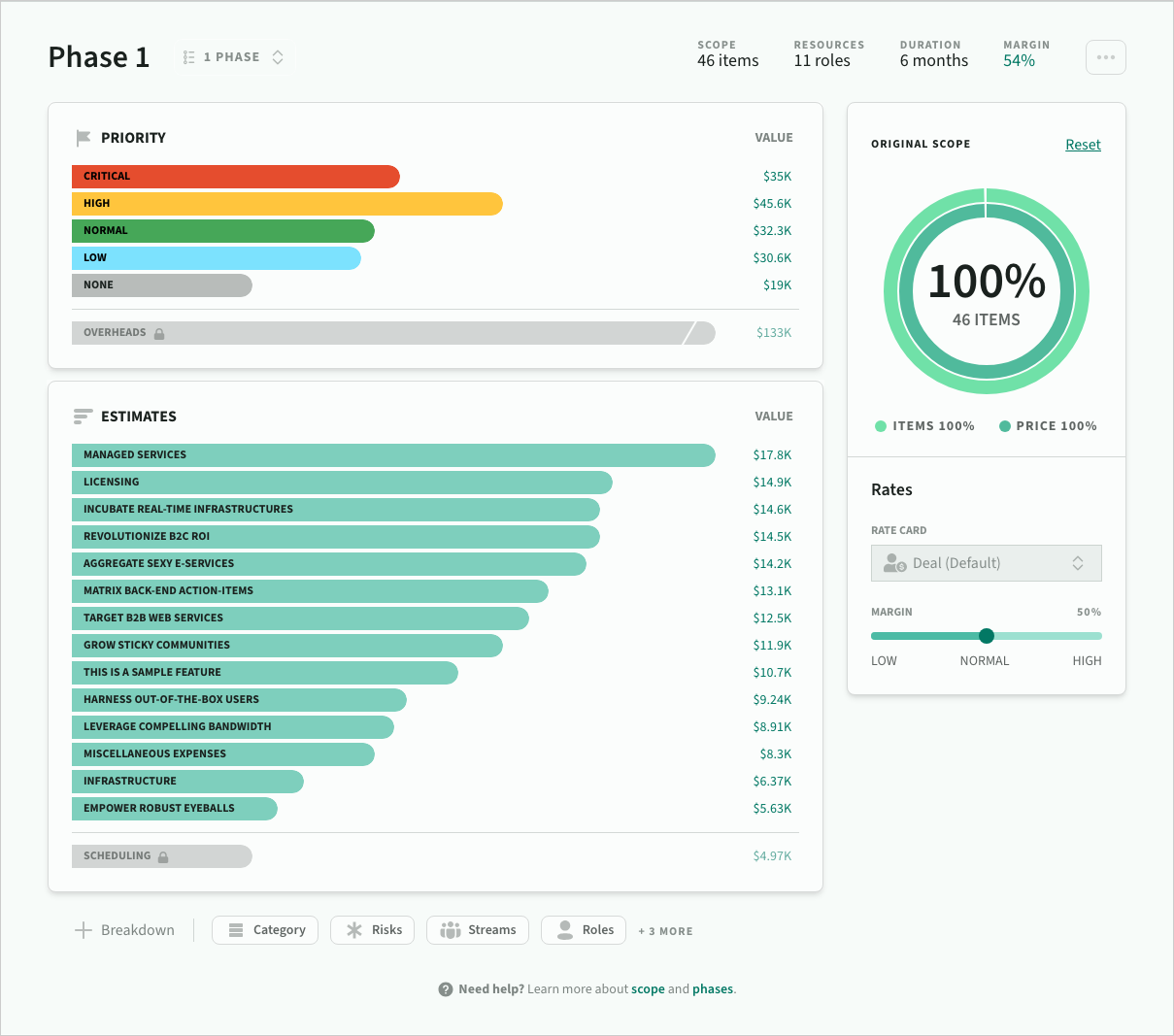 The key to effective scoping is using priorities, risks, tags, and categories in your estimates: