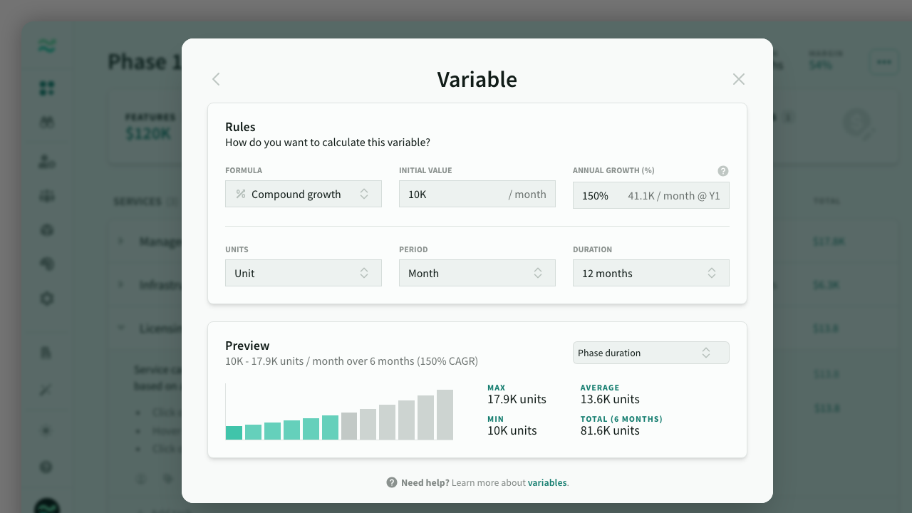 Variables are unit-based estimates that grow over time, such as end-user licenses or hosting costs based on the number of active users or activity. They are perfect for estimating monthly project costs based on projected volume or usage.