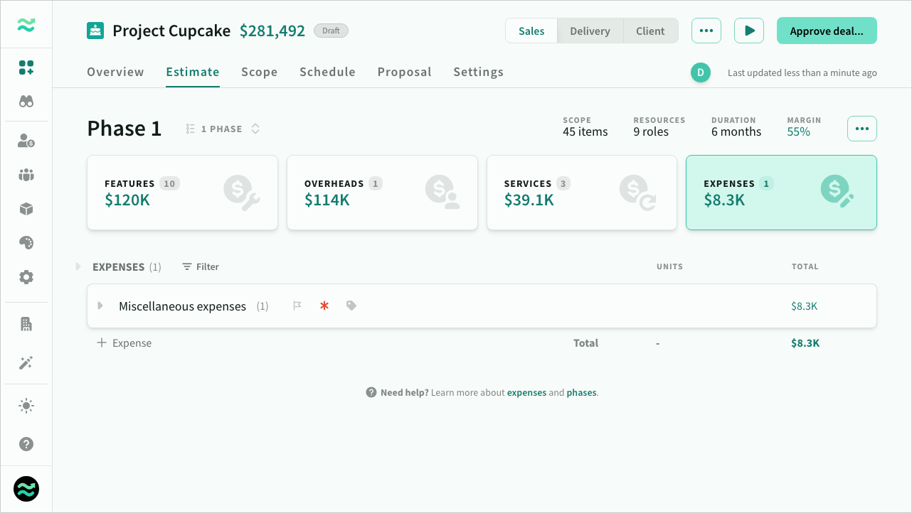 - Expenses - One-off unit-based costs associated with the phase such as hardware, software or travel