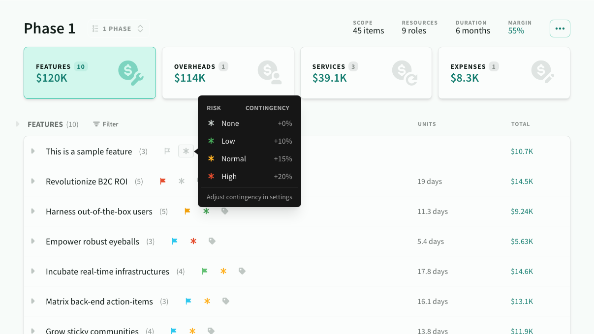 Contingency is automatically applied to features based on their risk level (none, low, normal, high) and added to the raw time estimates.