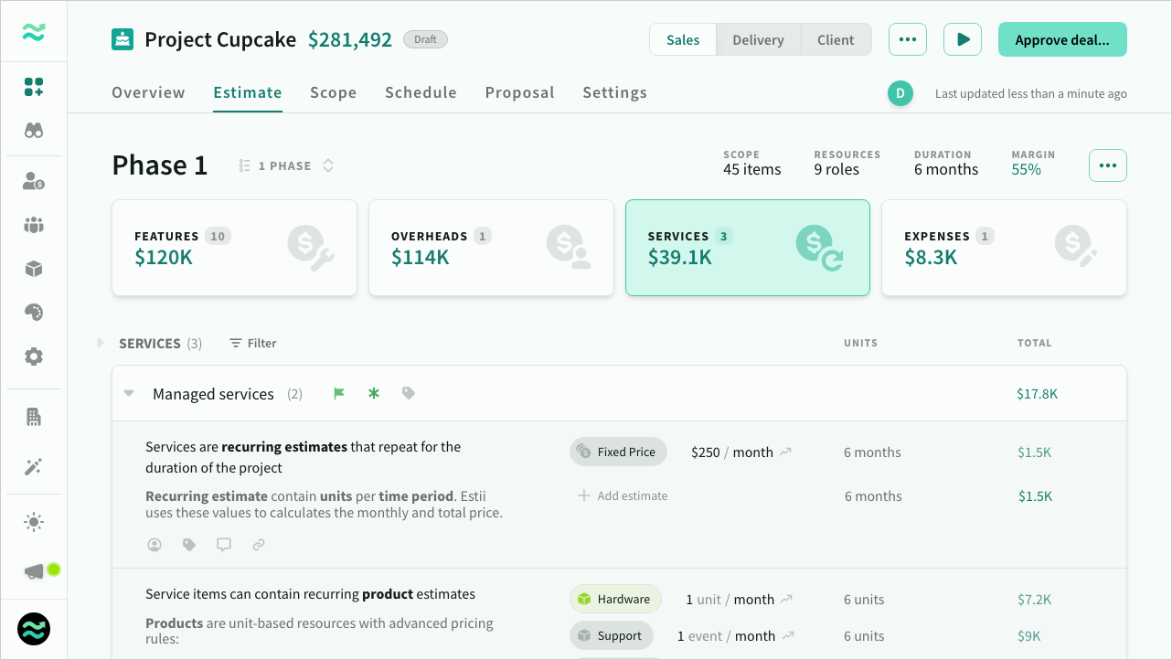 Services are recurring, unit-based estimates like hosting, licensing or other managed services that repeat throughout a phase