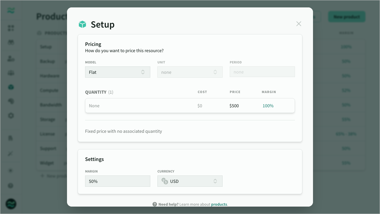 A Product is unit-based resource that can be used to estimate recurring services or one-off expenses.