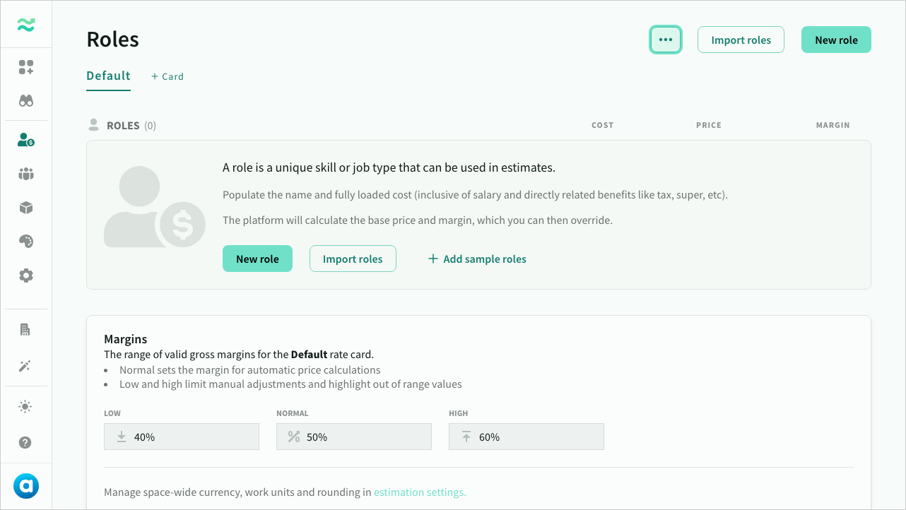 The default rate card contains the baseline cost and price for all roles in the space, along with a default margin and rate (hour, day, etc) for calculating prices.