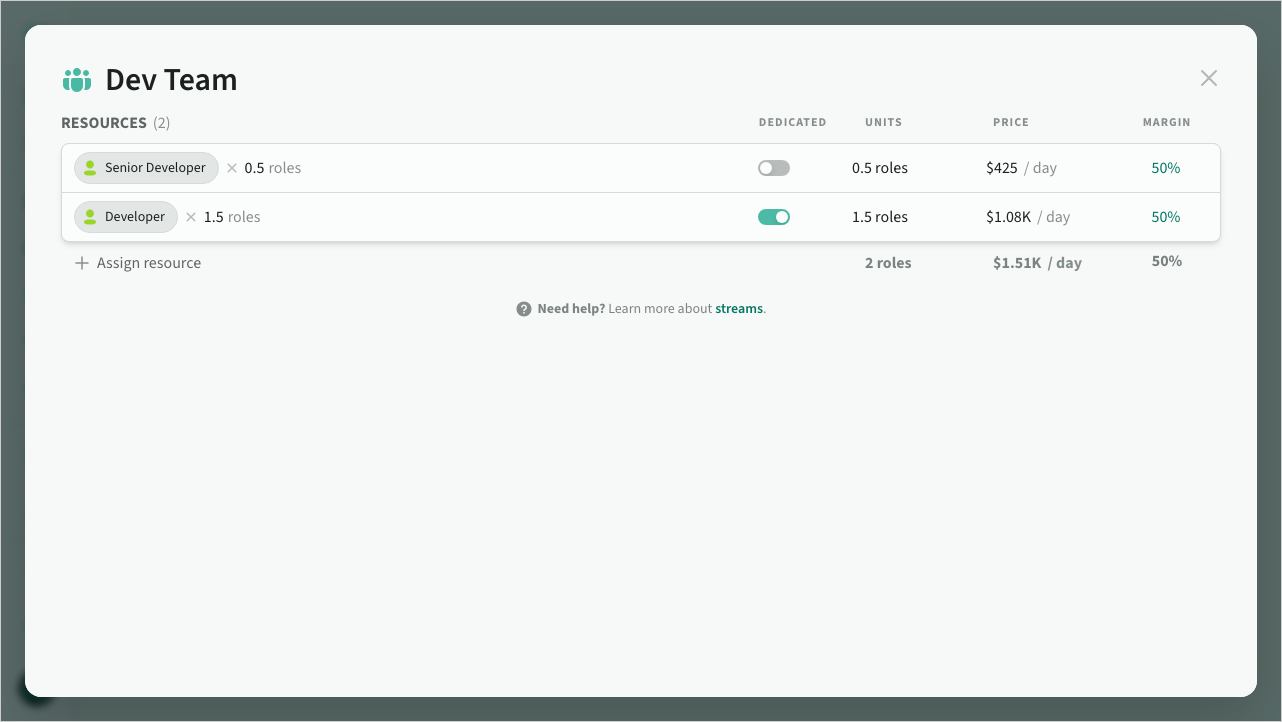 Roles are assigned to streams to reduce repetition of time-based estimates that require the same allocations of roles. Streams are also used to track costs associated with specific teams or deliverables.