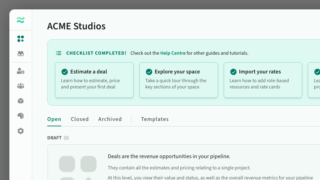 After creating a new space,, you will be directed into your first deal, and offered a short tour of the key features.
