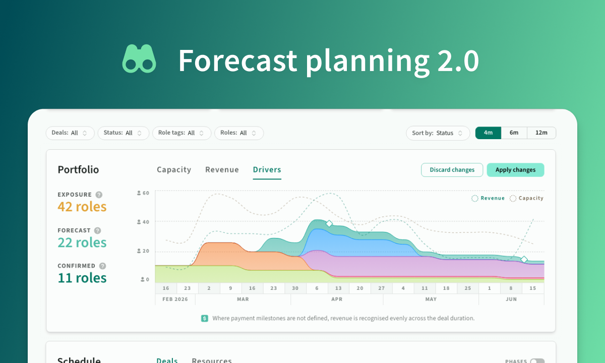 Search and import estimates from previous deals. Predict resource demand with capacity forecasts. Feature tags, Pipeline cards and much more