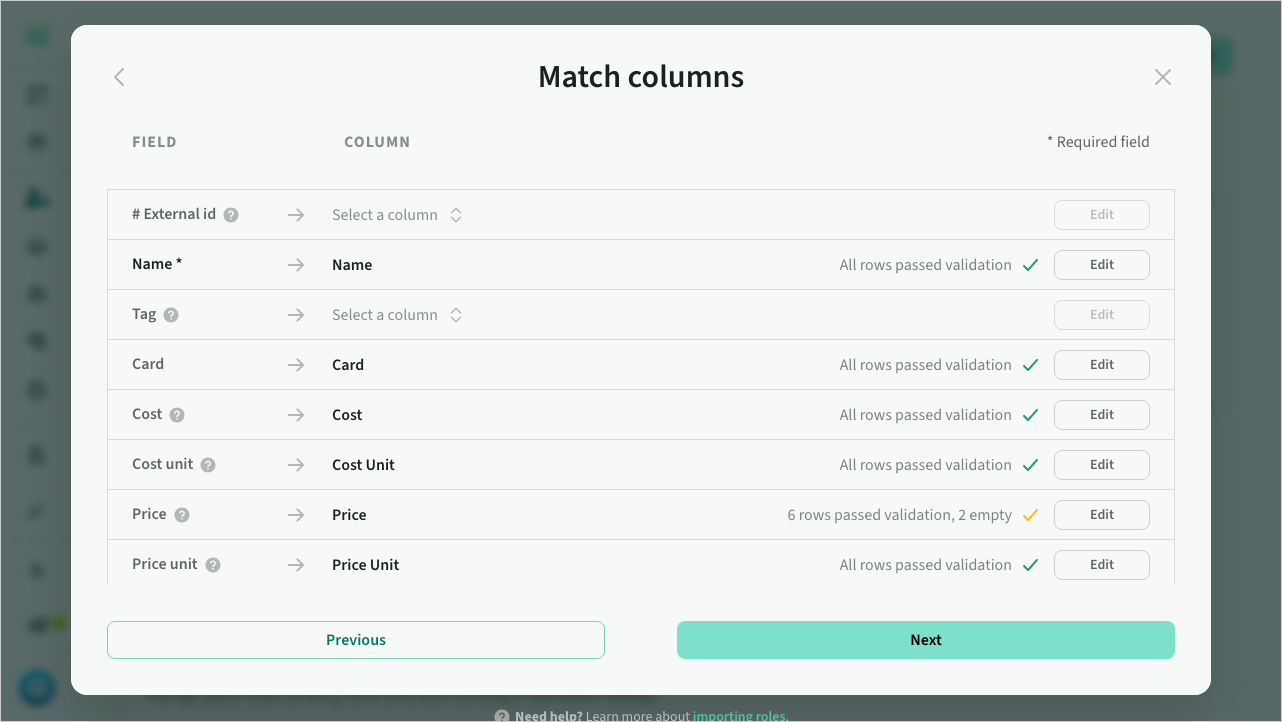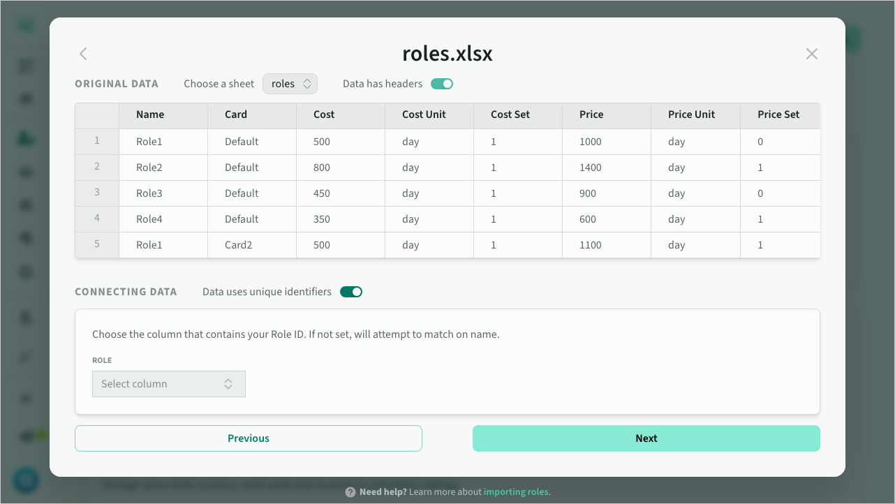 The role importer enables you to import rate cards from any existing spreadsheet or CSV format, with inline mapping and import preview.