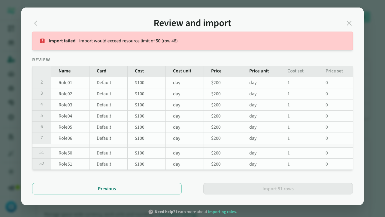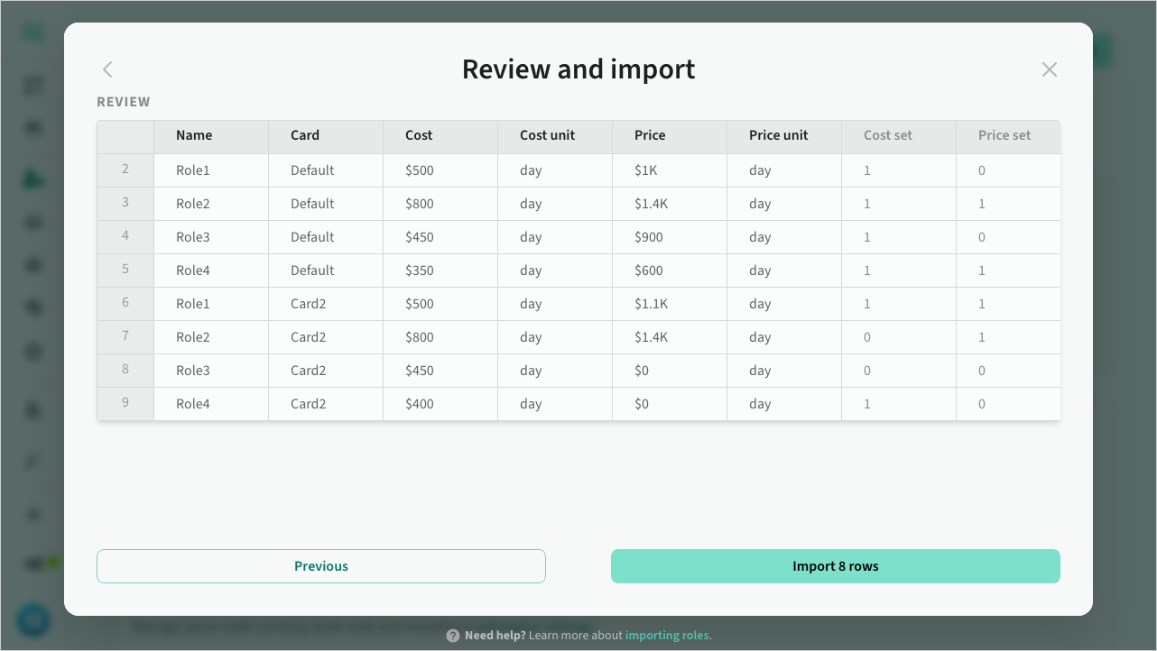 Importing roles and rate cards