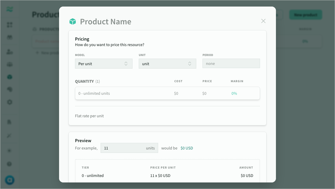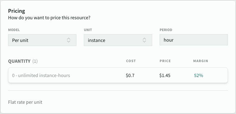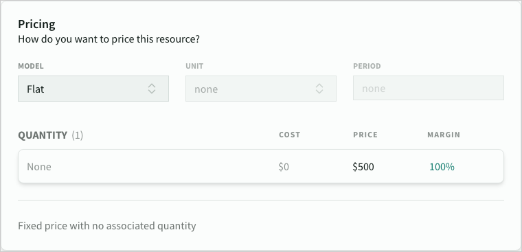 | Flat | Fixed price, no units | Setup fee of $1000 |