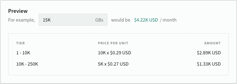 Like us, you probably find it hard to sometimes tell the difference between volume, tiered and stepped pricing. To make it easier, we've included an inline preview, where you can enter a sample unit size, and we will break down the price calculations for you.