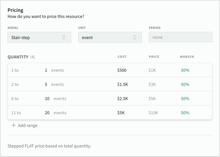- Stair-step pricing with a fixed price based the total number of units within a range