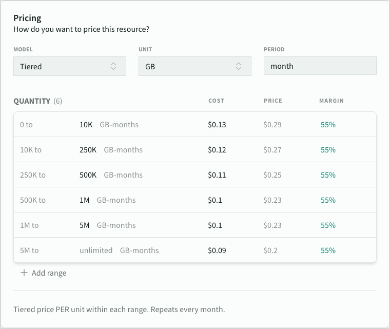- Tiered price per unit, with a maximum number of units in each range