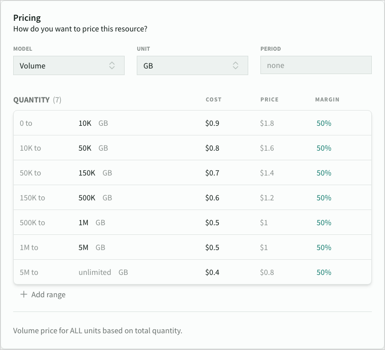 For each pricing rule (other than flat) you can define multiple quantity-based ranges with different unit costs, prices and margins.
