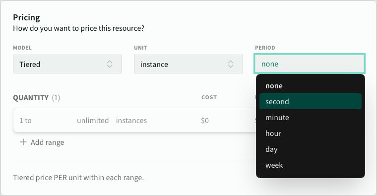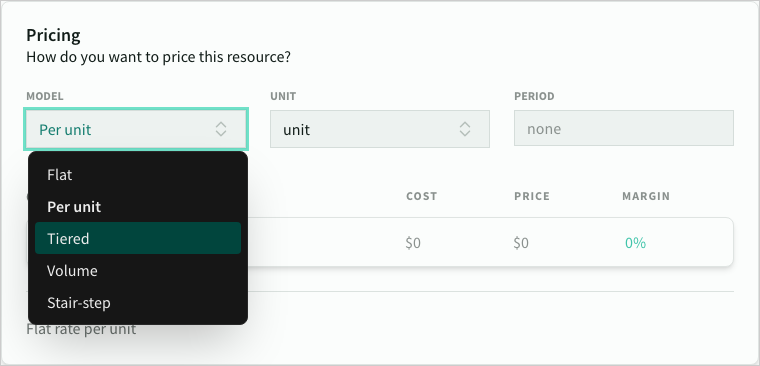 | Model | The pricing model for the product | tier | Required. one of flat, unit, tier, volume or stair |