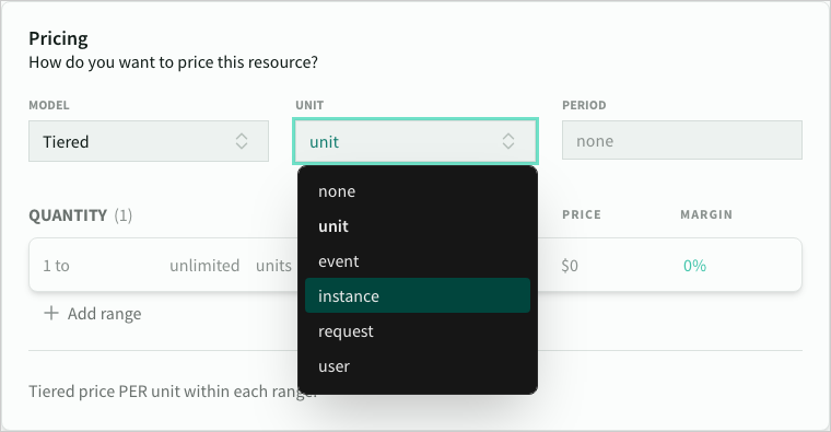 Every product has a unit type. This could be a built in unit type (such as GBs or Hours) , or a custom unit (such as Users, Events, Instances, Sessions or even Bananas).
