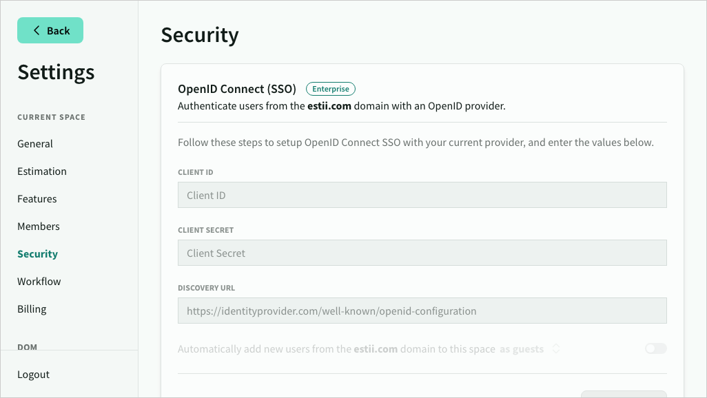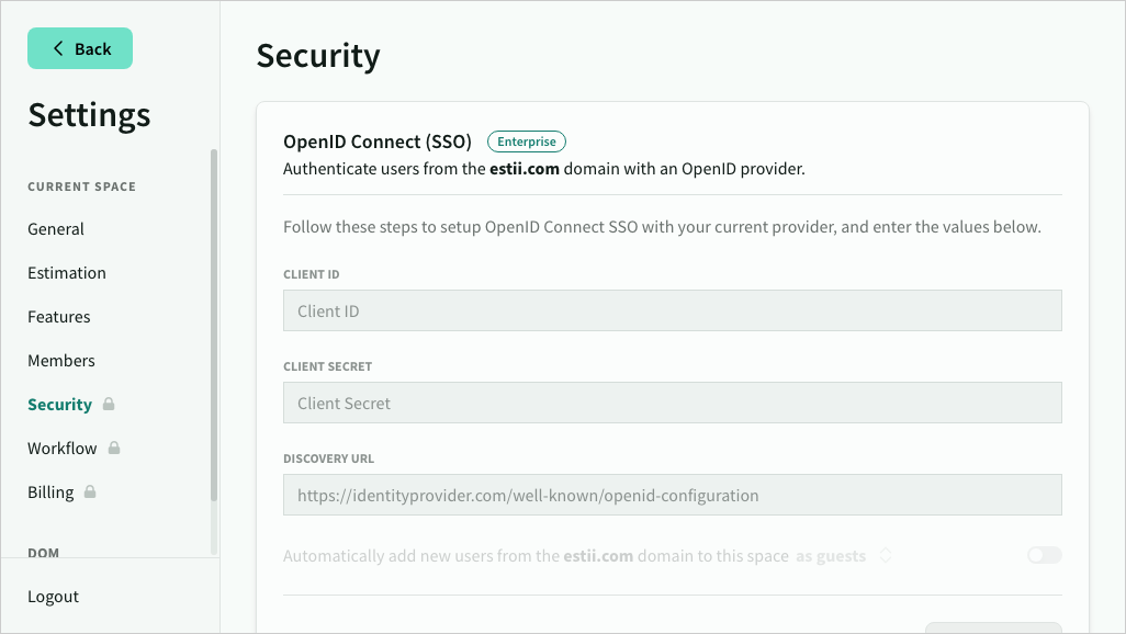 You can configure an SSO integration with Azure Active Directory, Google Cloud Identity or any other identity provider that supports OpenID Connect. Enterprise customers also have the ability to enforce SSO for all users in the space and disable other log in methods.