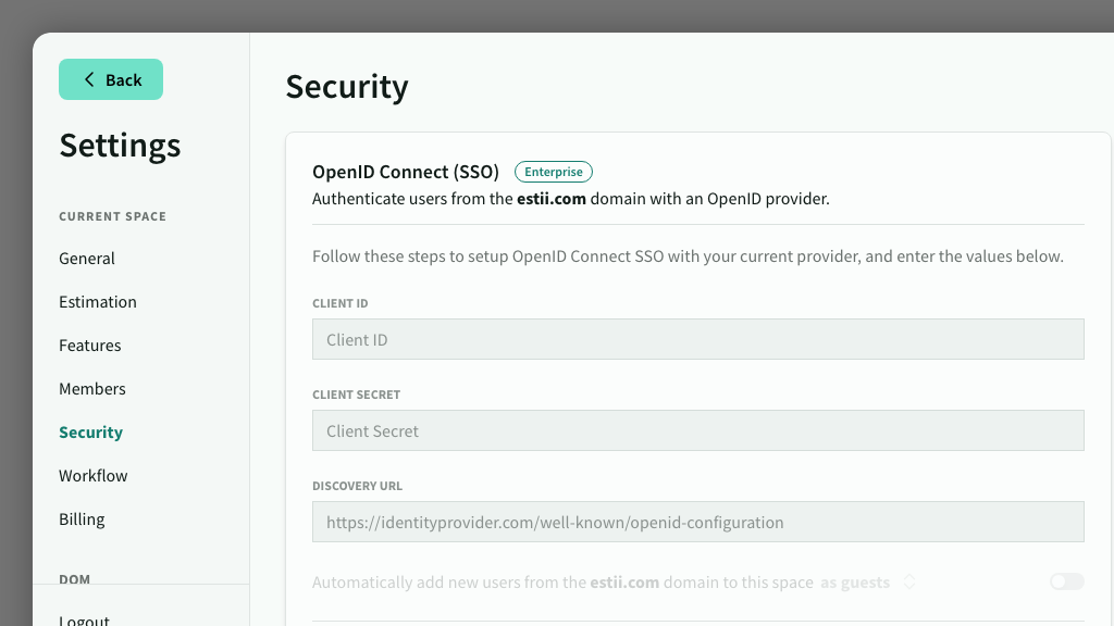 Estii offers multiple ways to log into a space. Sign in via SSO with an existing Google or Microsoft account, or configure an SSO integration