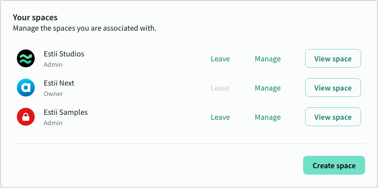 View or manage the spaces you are a part of, or create a new space. Non-owner members can leave a space from here — you'll be asked to confirm before being removed.